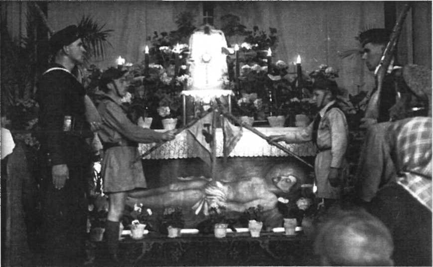 Grób Pański w naszym kościele, rok 1949; harcerz z lewej to Edward Kubiak