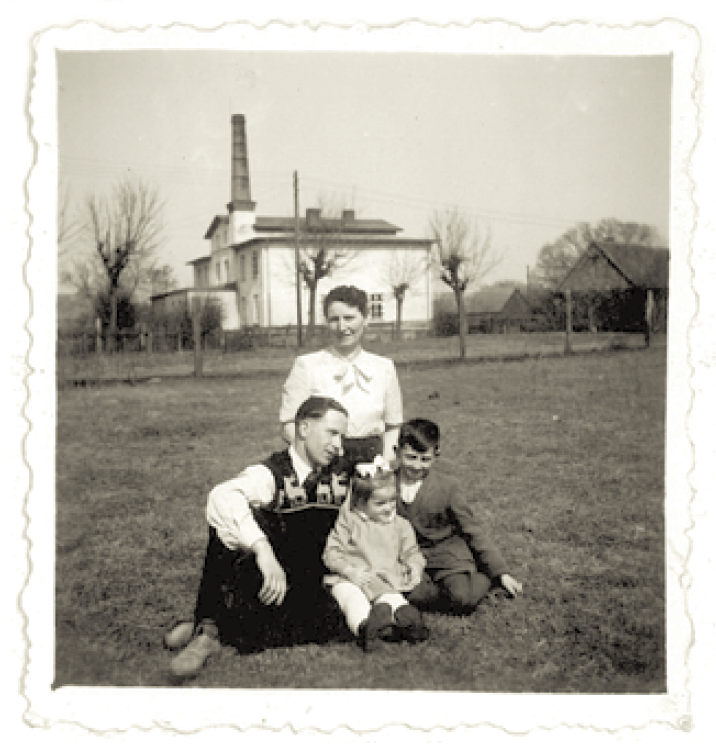 Powitanie Łeby ← Poprzednie Następne → Stefania Kurowska z dziećmi i kuzynem, w tle budynek starej mleczarni, rok 1950.